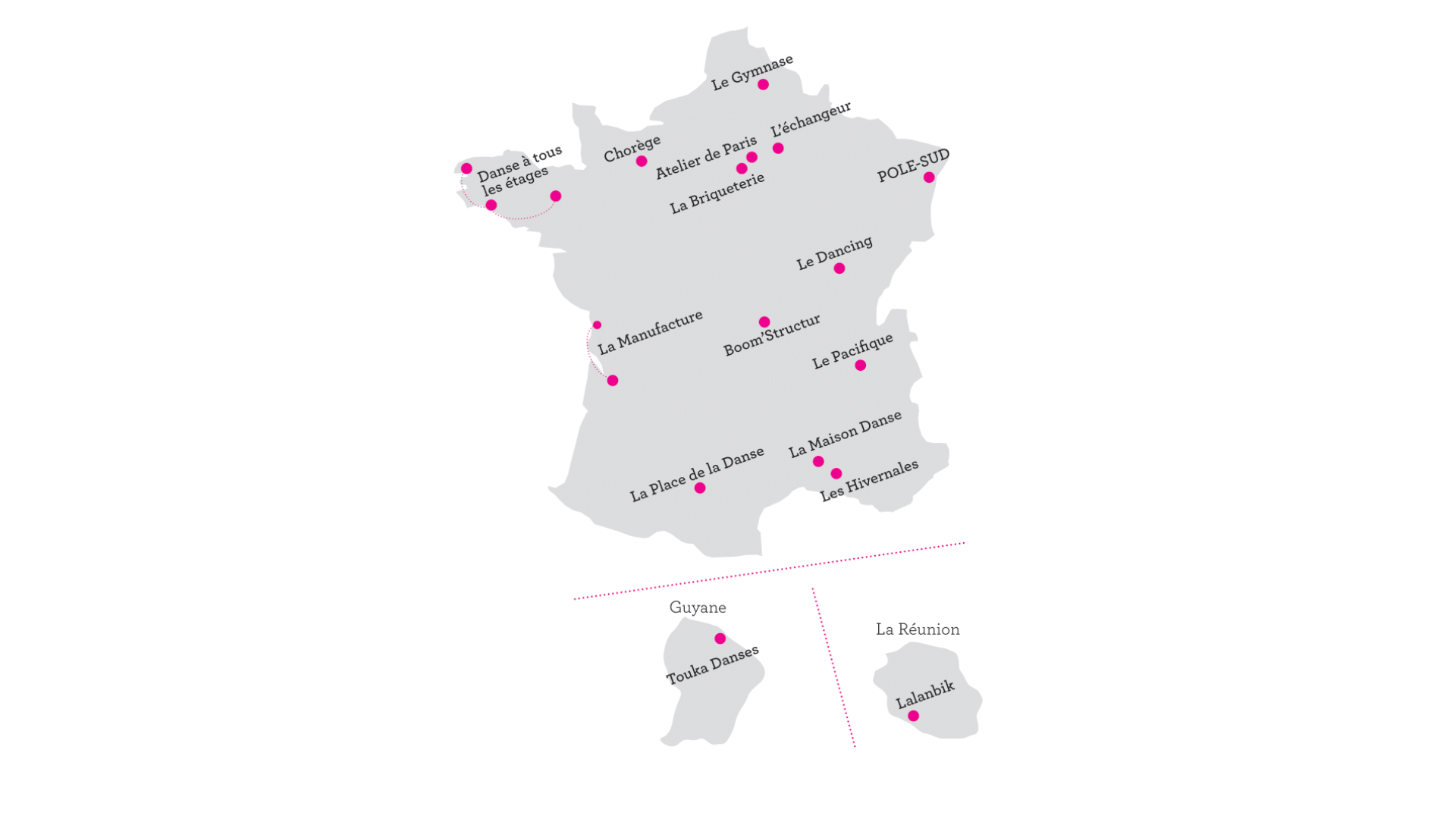* Le Cndc – Angers ; Le CCN - Malandain Ballet Biarritz ; Le CCN de Caen en Normandie ; La Comédie de Clermont-Ferrand, Scène nationale ; Boom’Structur (Clermont-Ferrand) ; Le CCN de Grenoble ; La MC2 : Maison de la culture de Grenoble ; La Maison de la danse de Lyon, Le CCN - Ballet national de Marseille ; Le CCN - Ballet de Lorraine ; Le Gymnase CDCN Roubaix Hauts-de-France ; La Place de La Danse - CDCN Toulouse / Occitanie ; La Briqueterie - CDCN du Val-de-Marne.
